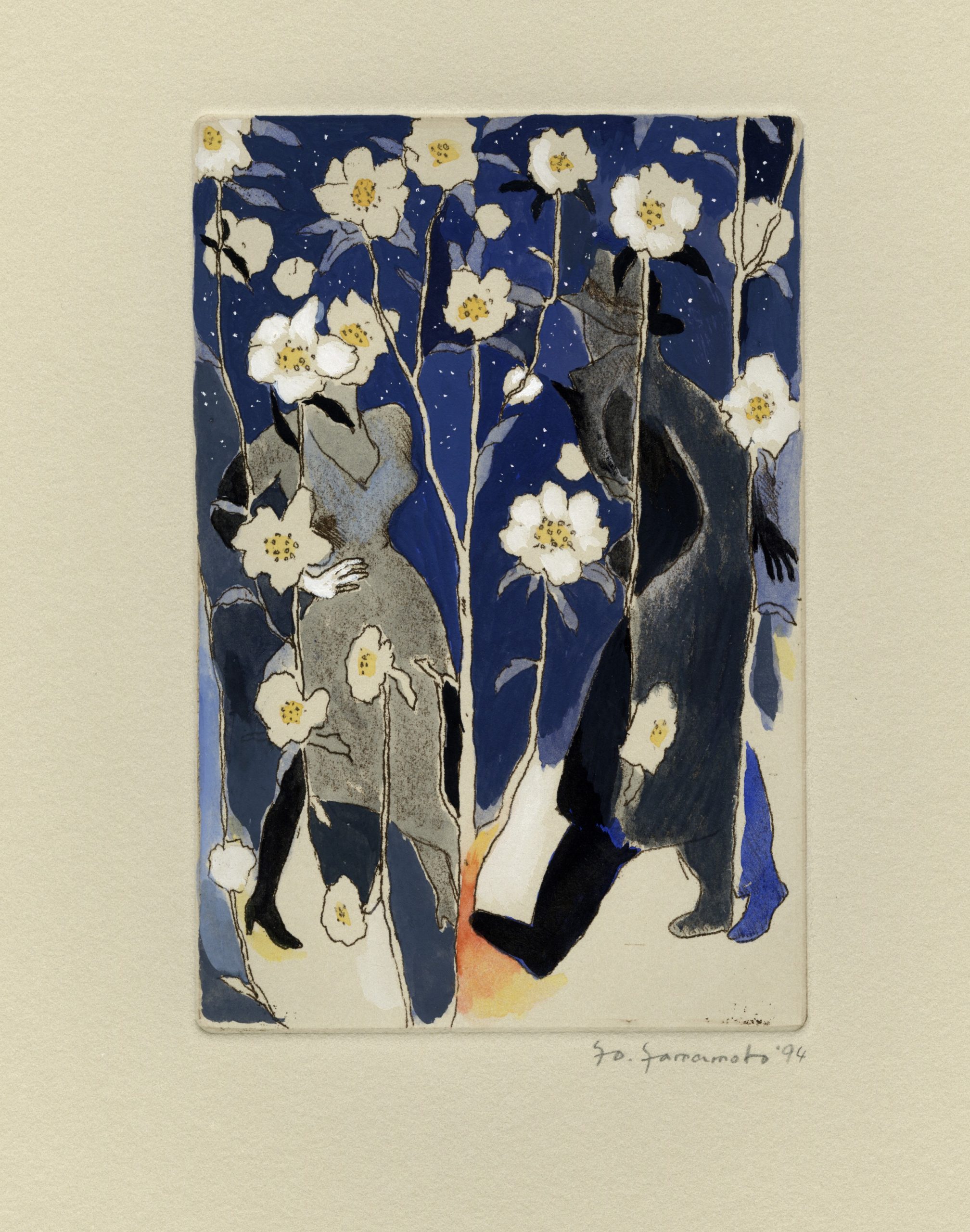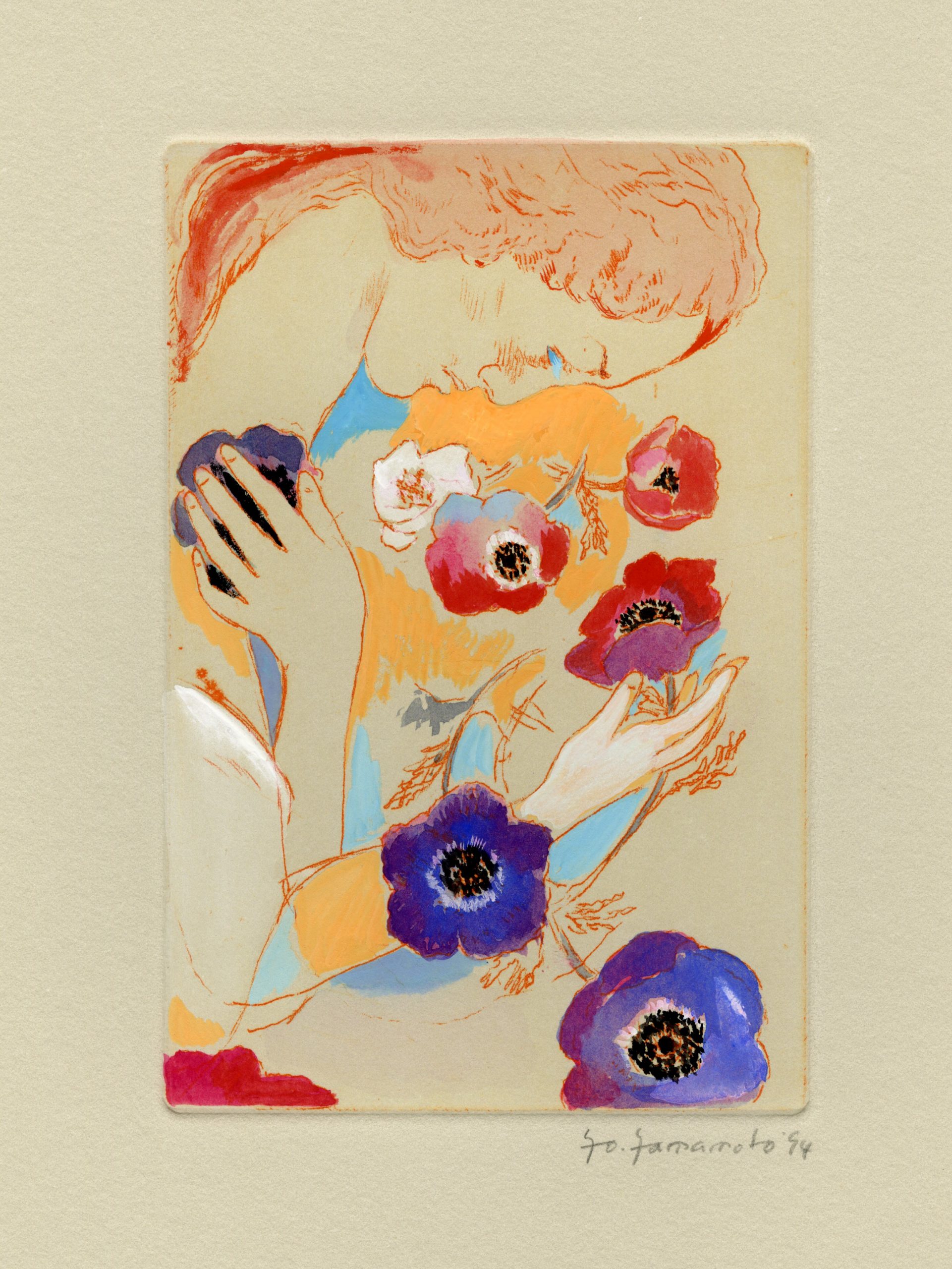 『花のレクイエム』の挿絵は、辻氏の文章をあえて事前に読まず、山本氏が独立した版画作品として制作したものです。94年から95年にかけて、辻氏の物語に思いを馳せながら生み出された幻想的な版画世界は、花々を軸に紡がれた小さな物語と深く共鳴し、一冊の美しい本として結実しました。その詩情豊かな世界をどうぞご堪能ください。