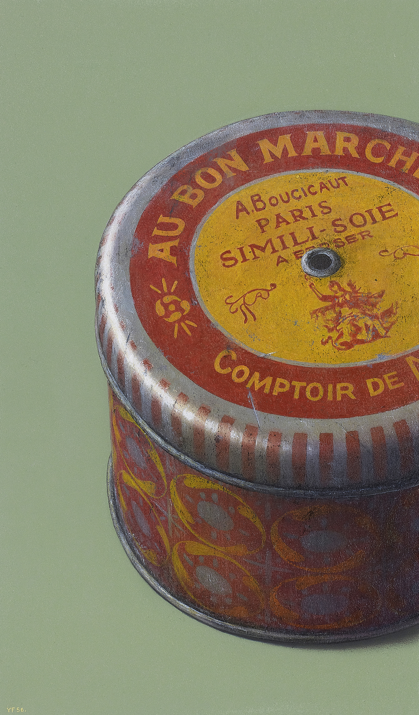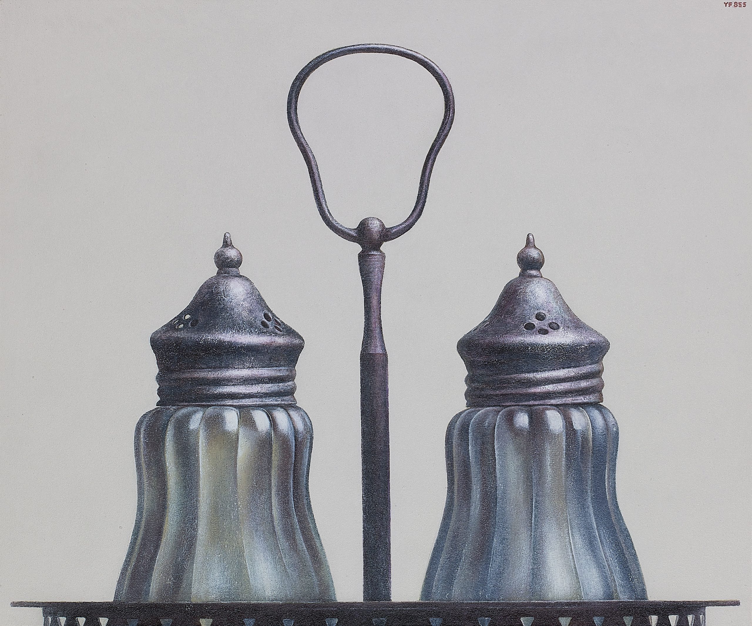 フルーツや野菜といった身近なモチーフから、ヨーロッパの骨董品や古道具まで、題材は多岐にわたり、いずれも作家の確かな観察眼と感性が感じられます。丁寧な筆運びで描かれるモチーフは、斬新な構図によって描かれ、静けさの中に緊張感を孕んだ独特の世界観を創り出しています。鉛筆ならではの繊細な線と、油彩による深みのある色彩が響き合い、藤田勇哉の表現の幅がうかがえます。
